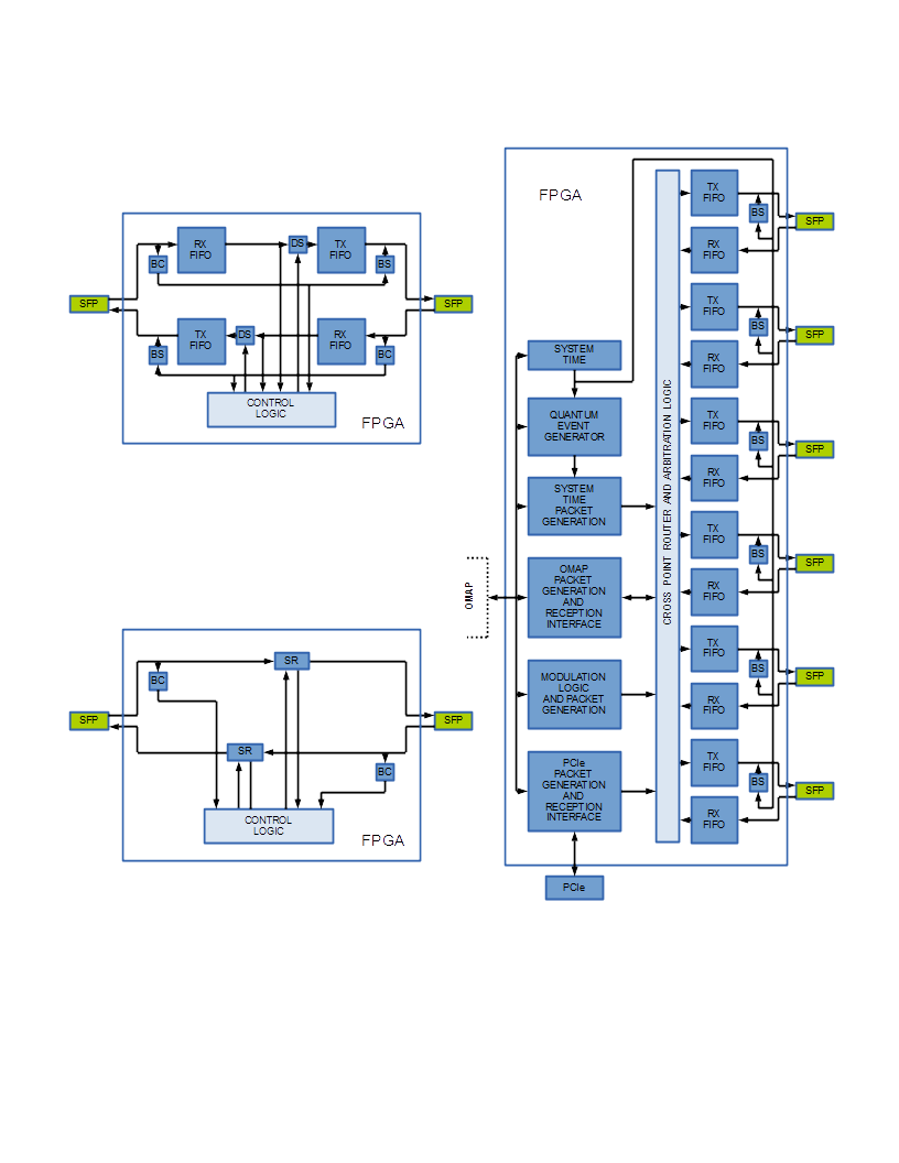 It turns out that modern FPGA’s such as the Xilinx® Series 7™ and Altera® Cyclone™ family contain integrated SERDES interfaces that are capable of operating at a minimum of 1 GHz. This coupled with Glass Fiber Optic transceivers and cables such as SFP+ allow for a very robust (high noise immunity), high throughput form of communications between each of the switch elements and the central controller.