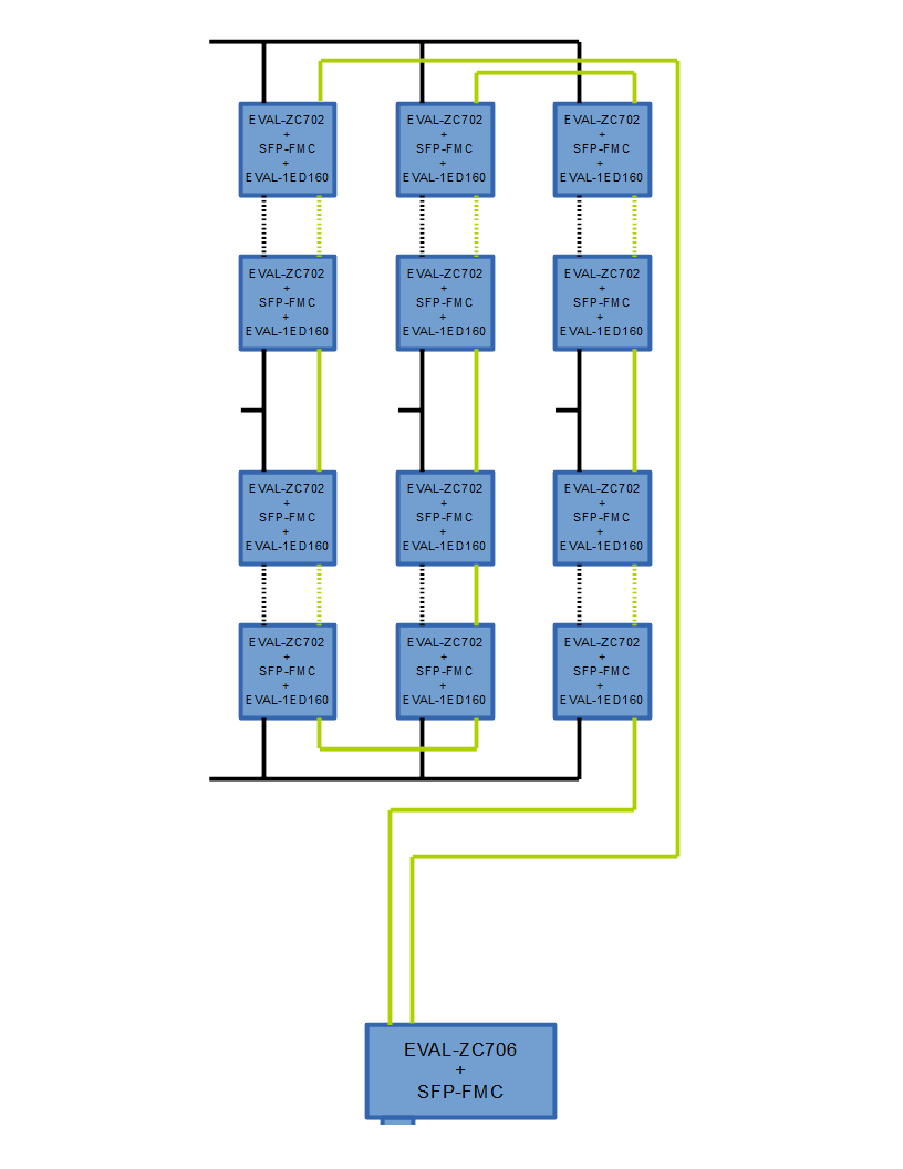 For the CTRL module, a Xilinx™ ZC706 Zynq® evaluation board and a plug-on dual SFP fiber FMC interface board. The Zynq contains a dual ARM processor and integrated FPGA. Combined with FMC interface board the implementation for our representative CTRL module is complete. This evaluation board can also be plugged into a PCIe slot on a PC, the use of this will be explained below.